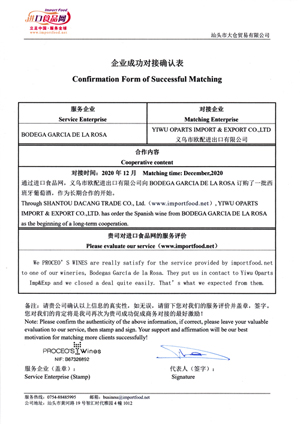 2021年3月,西班牙會員企業PROCEO'S WINES/BODEGA GARCIA DE LA ROSA確認與進口食品網推薦的中國買家——歐配進出口有限公司成功對接事宜,現中國買家已采購一批西班牙葡萄酒,預計4月份抵達中國市場。酒莊負責人David先生在確認函高度評價,“我們非常滿意進口食品網的服務,他們已協助我們的葡萄酒出口到中國市場,因為他們的對接,讓我們和中國買家的談判和交易過程更加快速和輕松,這是我們酒莊所期盼的。”