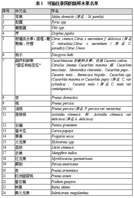 我國可向泰國出口的水果種類是指泰國農(nóng)業(yè)部網(wǎng)站(www.doa.go.th)所列出的新鮮水果,目前是24種類的水果,見表1,其中已經(jīng)與泰國農(nóng)業(yè)部交換果園和包裝廠注冊信息的水果包括蘋果、鮮梨、葡萄、棗、柑橘類水果(包括橙子、柚子、橘子、檸檬)、柿子、甜瓜和哈密、李子、桃(包括油桃)、獼猴桃、石榴12種水果。
