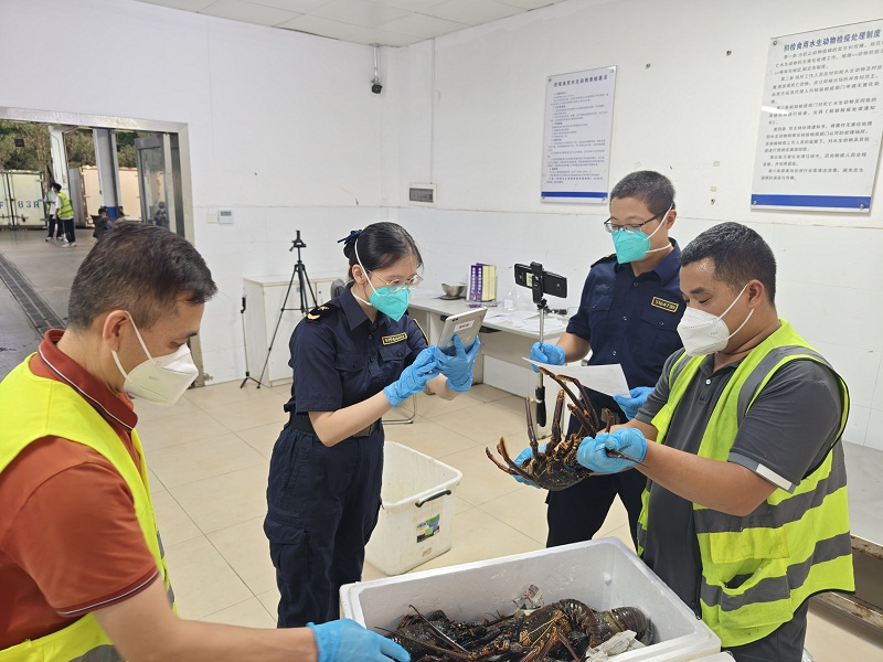圖為:關員對入境鮮活龍蝦開展查驗 關悅/攝
