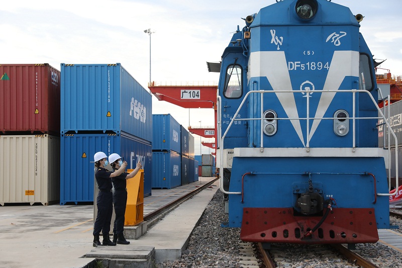 圖為:關(guān)員在廣州國(guó)際港對(duì)中歐班列進(jìn)行監(jiān)管 關(guān)悅/攝