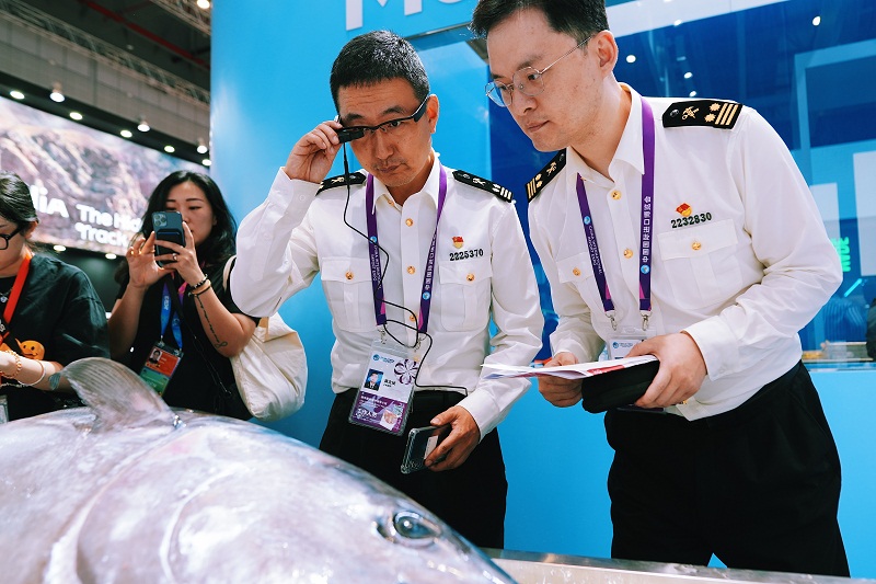 進博會展會期間,上海海關通過移動巡館設備和AR眼鏡,實現對馬耳他金槍魚等參展農食產品原產國家和地區準入情況的自動甄別,堅持科技賦能,借助“進博慧展”系統,對進境展品進行全鏈條數字化管理,提升監管能力和水平。