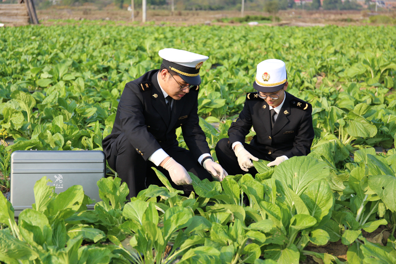 圖為:關員在出口蔬菜備案基地開展日常監測