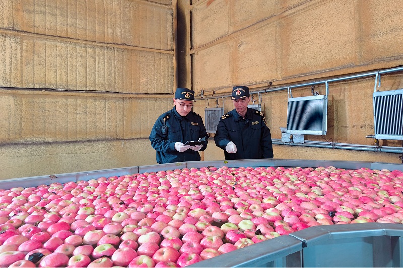 圖為:關(guān)員對出口蘋果實施現(xiàn)場監(jiān)管 程俊/攝