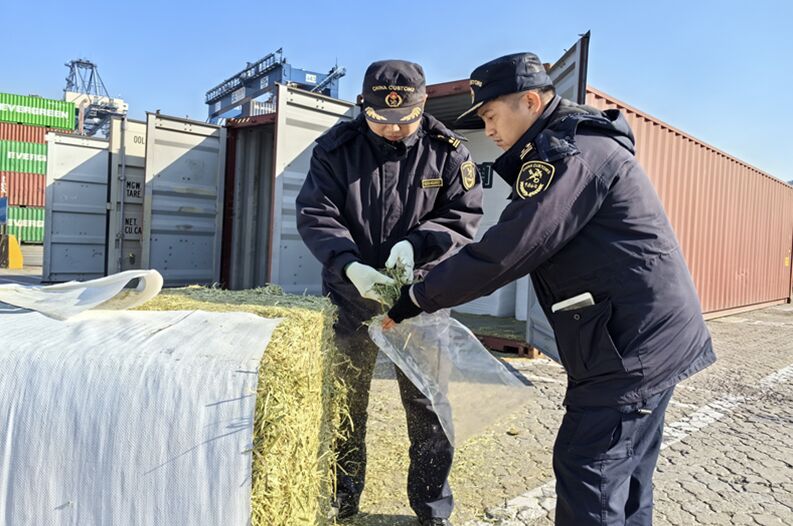 進口飼草質量安全直接影響乳制品安全。天津海關在保障貨物高效通關的同時,切實加強對進口苜蓿草的檢驗監管,嚴格遵守相關檢驗檢疫要求和進口許可要求,重點檢查進口苜蓿草中是否存在活的昆蟲、螨、軟體動物及雜草植株等有害生物、土壤以及存在腐敗變質等情況,確保監管到位,保障動物們“舌尖上的安全”。