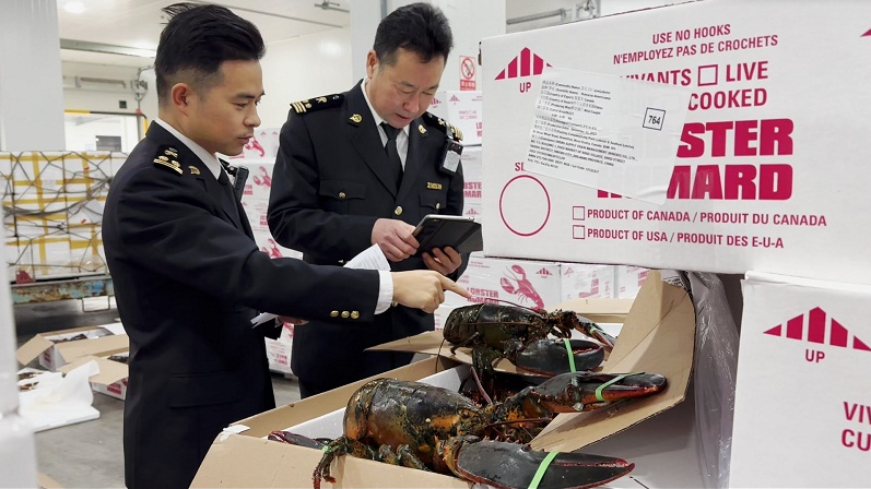 圖為:寧波機場海關查驗進口龍蝦 彭思雪/攝