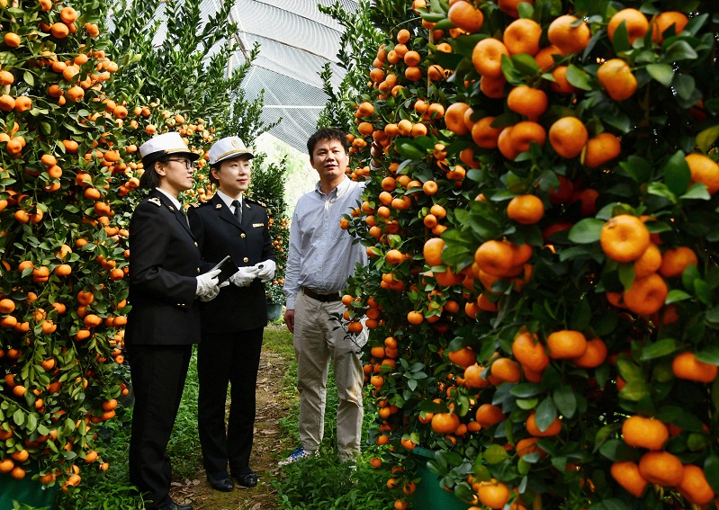 圖為:關(guān)員在花場對出口年桔開展檢驗(yàn)檢疫 王麗歡/攝