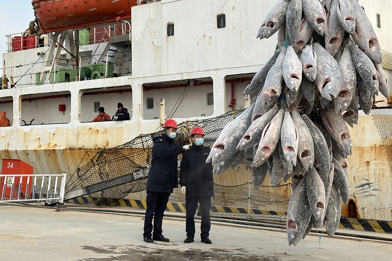 為******限度保證進口金槍魚品質,榮成海關梳理進口全流程,制定了一系列的優化監管措施。在船舶檢疫環節,海關與船代公司密切溝通,實現“人等船”,船舶靠泊即登臨檢疫。在貨物申報和查驗環節,海關指導企業應用提前申報,開通屬地查檢快速通道,實現“邊卸邊檢、船邊直提”。在企業、港口、海關多方通力配合下,金槍魚的通關接卸時間大幅縮短,確保全程冷鏈、新鮮到工廠。