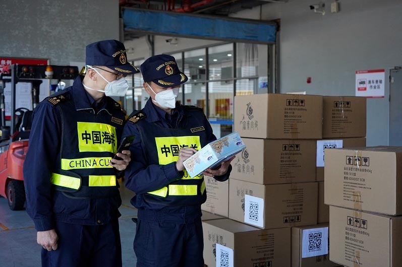 圖為:關員對首批實施“一碼通溯源”的澳門食品進行查驗 陳綺汐/攝