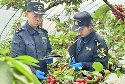 圖為:關(guān)員在果園開展出口櫻桃查驗(yàn)? 徐一丹/攝