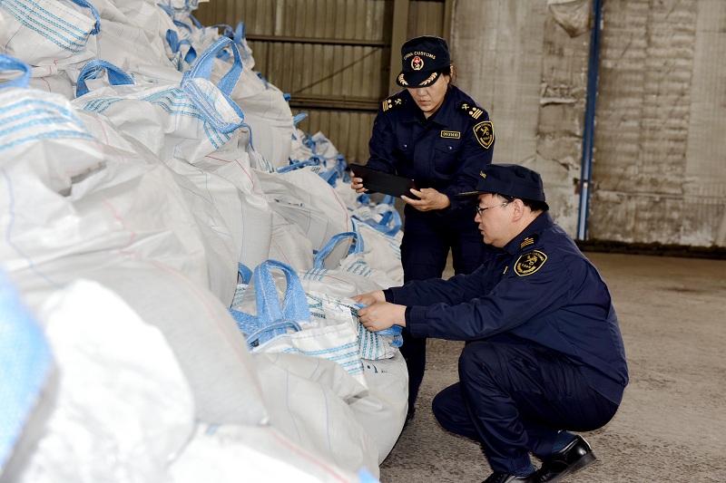 圖為:關(guān)員對(duì)進(jìn)口化肥進(jìn)行現(xiàn)場(chǎng)監(jiān)管 郭強(qiáng)/攝