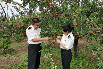 圖為:關(guān)關(guān)員在出口水果果園開展監(jiān)管 魏珊珊/攝