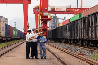 圖為:關員在寧波舟山港鐵路北侖港站了解海鐵聯(lián)運生產(chǎn)作業(yè)情況 高雪峰/攝