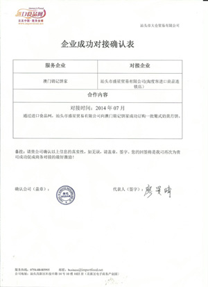 2014年7月,通過進(jìn)口食品網(wǎng),汕頭市盛星貿(mào)易有限公司(淘度客進(jìn)口商品連鎖店)與澳門錦記餅干食品廠成功對接。錦記餅干食品廠是澳門一家傳統(tǒng)的糕點企業(yè),擁有自主品牌“澳錦記”,其創(chuàng)辦人鄧總希望通過進(jìn)口食品網(wǎng)尋找大陸市場的經(jīng)銷商,讓更多人品嘗到“澳錦記”糕點(包括雞蛋卷、杏仁餅和月餅等)。在進(jìn)口食品網(wǎng)的引薦下,汕頭市盛星貿(mào)易有限公司林總親自到訪澳門,與錦記餅干食品廠鄧總面對面交流,現(xiàn)場采購一批澳錦記葡式奶皇月餅,為長期合作奠定基礎(chǔ)。對此,“澳錦記”鄧總對進(jìn)口食品網(wǎng)的努力推薦表示感謝并發(fā)來《成功對接確認(rèn)表》,我們也期待更多的合作,助力更多澳門糕點進(jìn)入大陸市場。