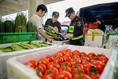 圖為:關員對供澳蔬菜進行查驗 俞波/攝