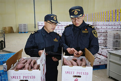 圖為:關員對出口甘薯進行現場監管 王勇/攝