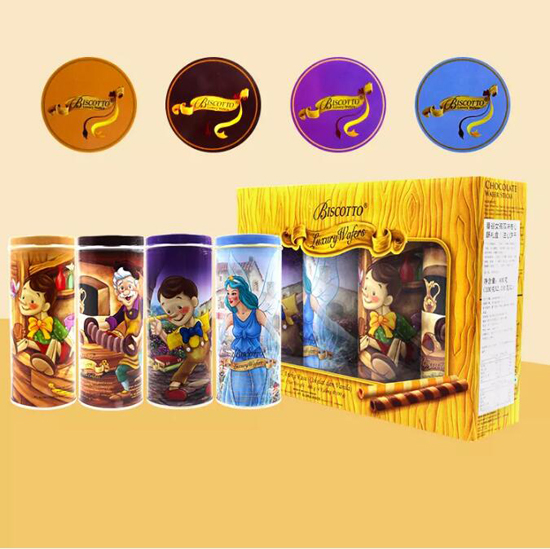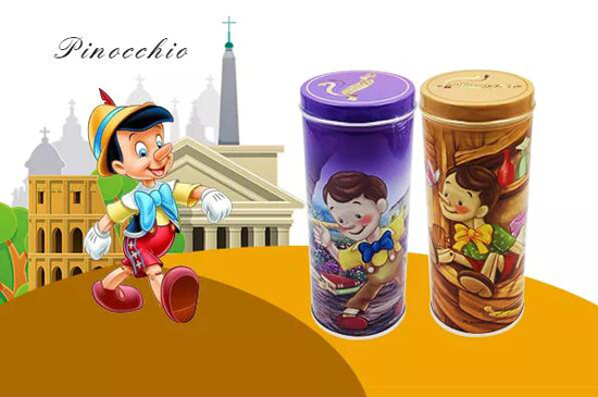 蔓谷女孩卷心酥整體采用鐵罐包裝,精美的圖案取材于家喻戶曉的意大利童話故事匹諾曹,兩大口味的包裝各分兩種,貼近場景的配色拉近了與消費者的距離,握在手里有一種回味童年的感覺。罐裝密封保存,里面更有錫膜包裹,不僅便于運輸攜帶,而且很好的保證了食品的干凈衛生。