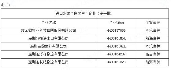 三、深圳關(guān)區(qū)進(jìn)口水果“白名單”企業(yè)名單由深圳海關(guān)綜合評定后,在深圳海關(guān)網(wǎng)站公布并實(shí)施動(dòng)態(tài)調(diào)整(第一批“白名單”企業(yè)見附件)。