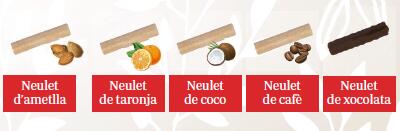 這款產品由60%巧克力、21%杏仁、6%椰子絲、面粉、糖、鹽和速溶咖啡等成分制作而成,共有五種口味,包括原味、橘子味、巧克力味、咖啡味和椰子味。